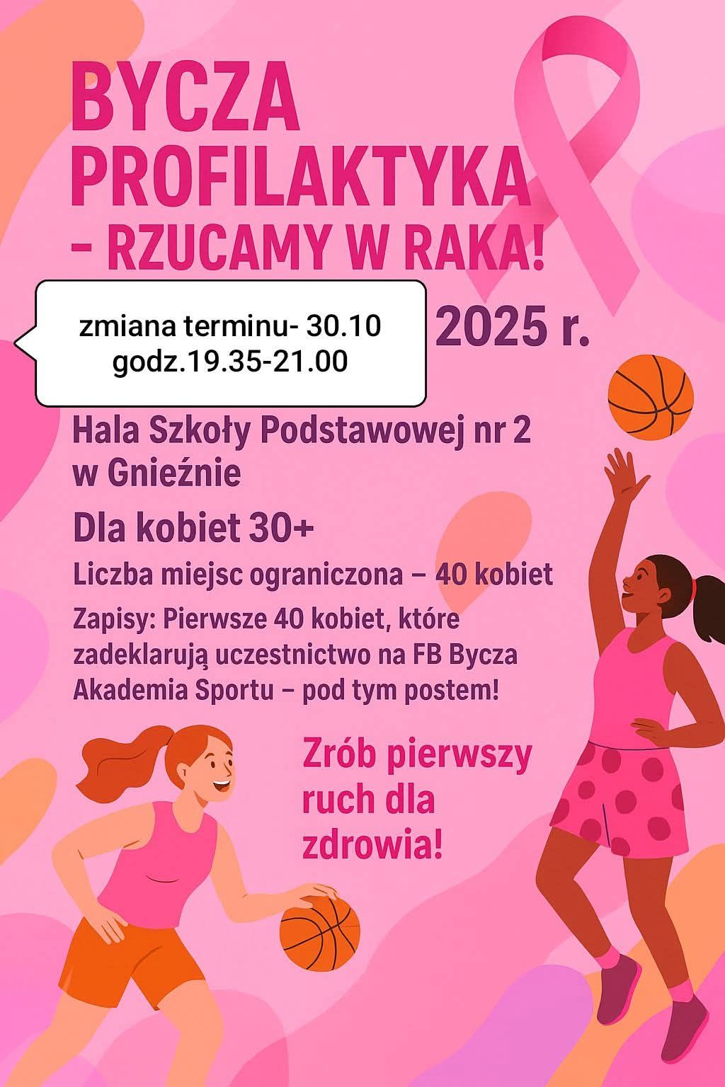 UWAGA! Komunikat! Wystarczy wejść na profil Byczej Akademii i dodać komentarz pod postem "będę" ... Więcej informacji poniżej Różowy październik Nasza Szkoła, wspólnie z partnerskim klubem Byczej Akademii Sportu organizuje event dla Pań 30+. Celem jest zwiększenie naszej świadomości co do profilaktyki badań piersi świetna zabawa Integracja kobiet Aktywne spędzenie wolnego czasu 30 października 2025r. 19:35-21:00 Hala Szkoły Podstawowej nr2 w Gnieźnie Ilość miejsc jest ograniczona: 40 Aby wziąć udział, należy wejść w link i na stronie Byczej Akademii napisać komentarz, "będę". Pierwsze 40 osób zapraszamy w dniu treningu. Zachęcam do zapisywania się na listę rezerwowych, przez dodanie w komentarzu chęci udziału Weź ze sobą strój sportowy Zapraszamy, Bycza & SP2