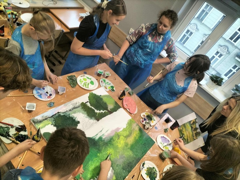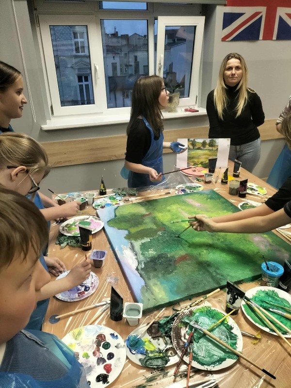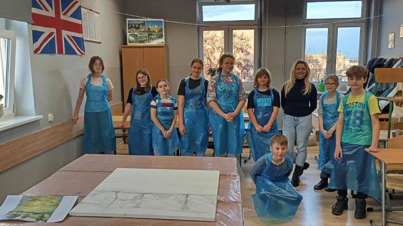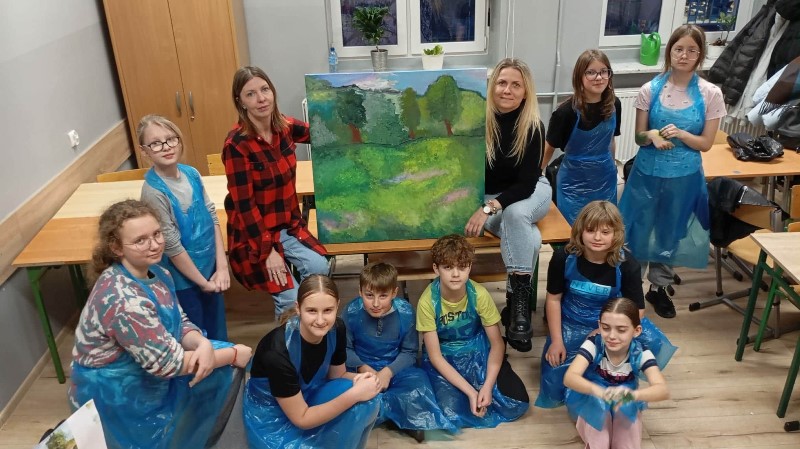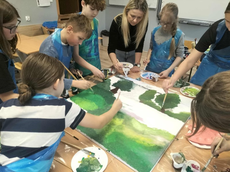 W naszej szkole działo się dziś coś niesamowitego! Gościliśmy utalentowaną lokalną artystkę - panią Aleksandrę Mikułę, która poprowadziła akcję: ,,Malujemy sercem V". Tematem przewodnim był urokliwy pejzaż, który krok po kroku uczniowie wspólnymi siłami przenieśli na płótno. Powstało prawdziwe dzieło sztuki, które ma nie tylko artystyczną wartość, ale przede wszystkim wielką moc pomagania! Obraz, który namalowali nasi uczniowie zostanie przekazany na WOŚP!