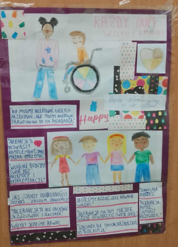 Dzień Tolerancji - 16 listopada. Uczniowie stworzyli wyjątkowy łańcuch jedności, symbol współpracy, szacunku i akceptacji. Podczas zajęć z wychowawcą nauczyciele- wychowawcy poruszali tematykę tolerancji, prowadzili rozmowy, które skłaniały uczniów do refleksji związanych z tym zagadnieniem. Uczniowie wykonali również piękne plakaty pod hasłem: „Wszyscy inni- każdy równy" , które ozdobiły drzwi sal lekcyjnych, aby w ten sposób przypomnieć nam o sile różnorodności.