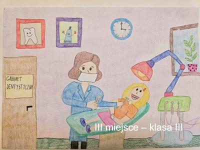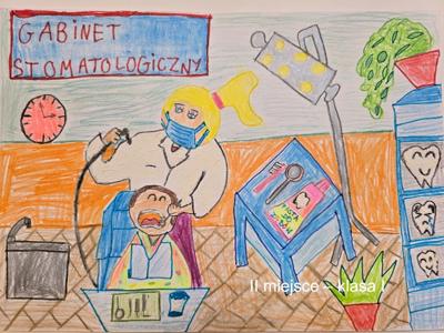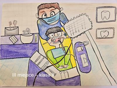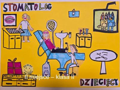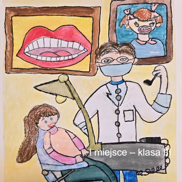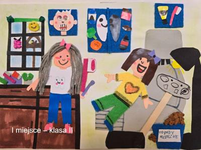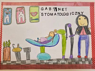 Gratulacje dla naszej uczennicy Amelki Marciniak, która zajęła I miejsce w konkursie plastycznym dla uczniów klas I-III szkół podstawowych. Konkurs plastyczny dla uczniów klas I-III szkół podstawowych „MOJA WIZYTA W GABINECIE STOMATOLOGICZNYM” ROZSTRZYGNIĘTY. Zadanie konkursowe polegało na wykonaniu pracy plastycznej w formacie A4 pod hasłem „Moja wizyta w gabinecie stomatologicznym” przy użyciu dowolnej techniki: rysunek, malarstwo, wydzieranka, wycinanka i wszelkiego rodzaju wyklejanki z użyciem różnych materiałów