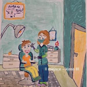 Praca miała przedstawiać wizytę w gabinecie stomatologicznym z uwzględnieniem charakterystycznych elementów wyposażenia pomieszczenia oraz osób w nim przebywających (stomatologa i pacjenta)