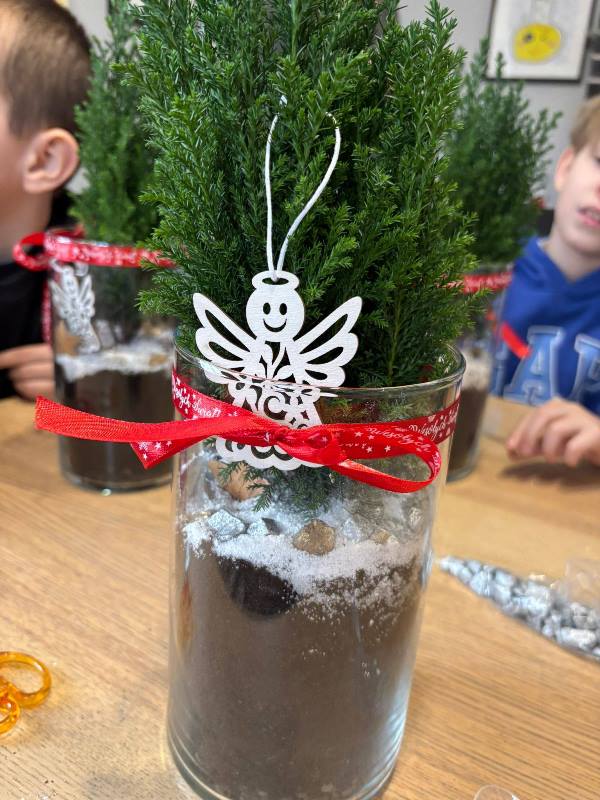 Uczniowie pięknie ozdobili swoje drzewka aniołkami, brokatem, złotymi kamyczkami i piękną wstążką. To był mile spędzony czas, który wprowadził całą klasę w świąteczny nastrój.